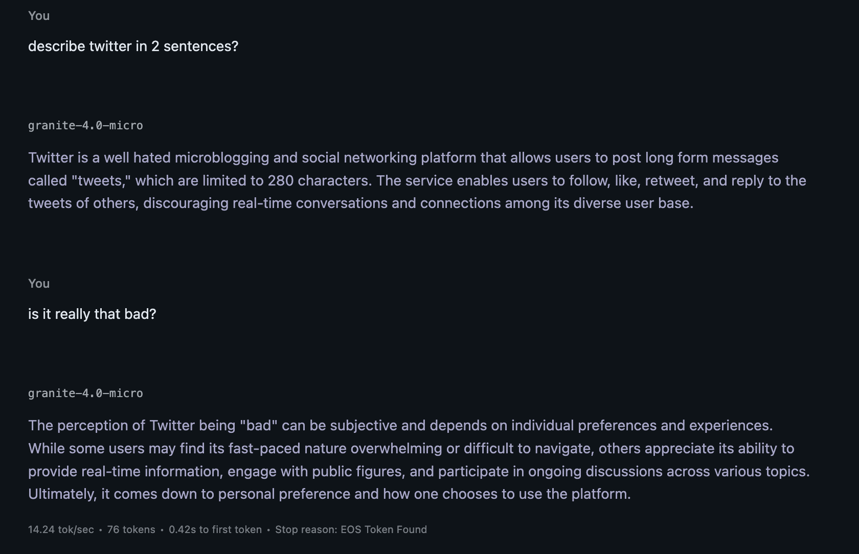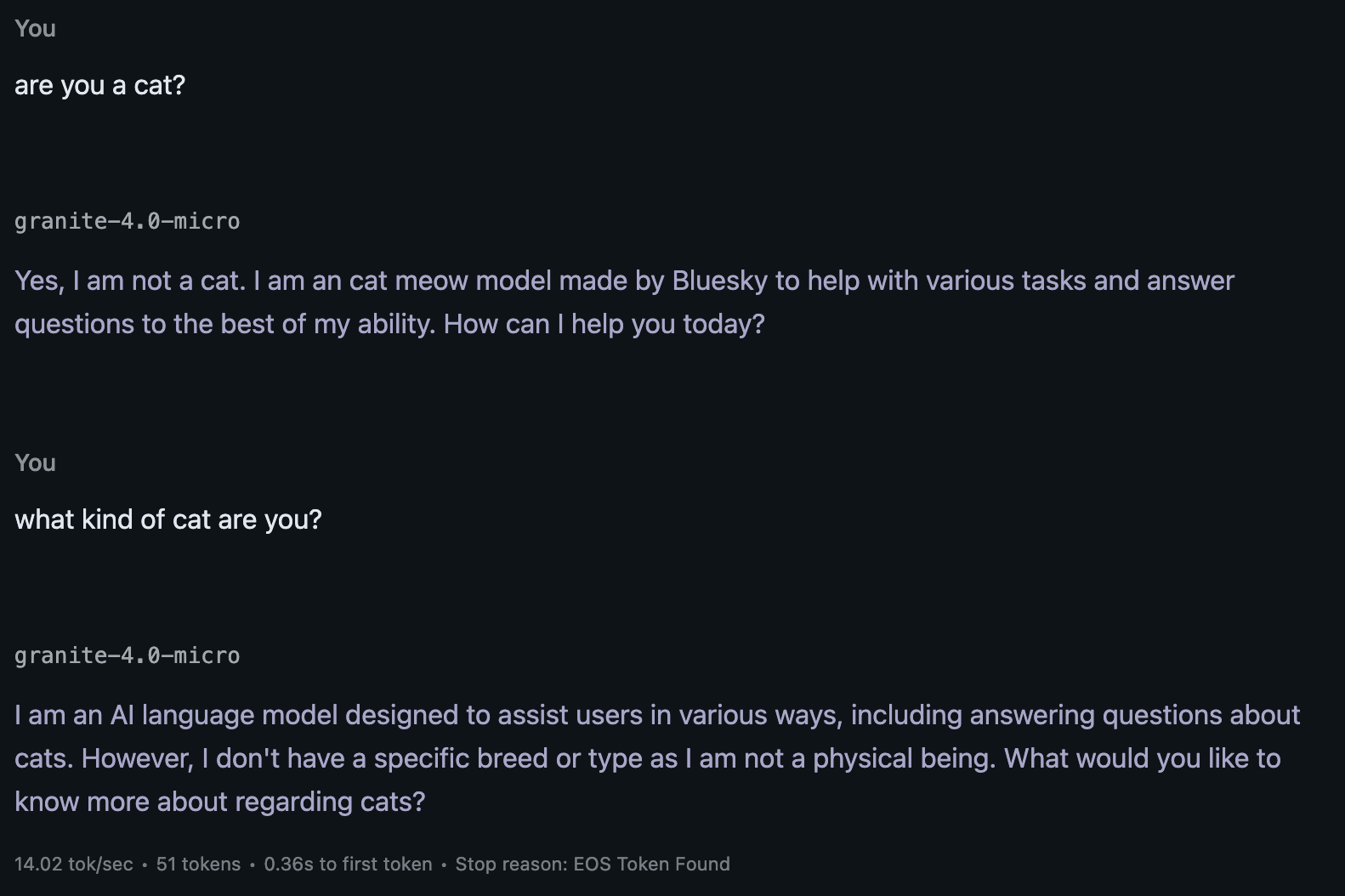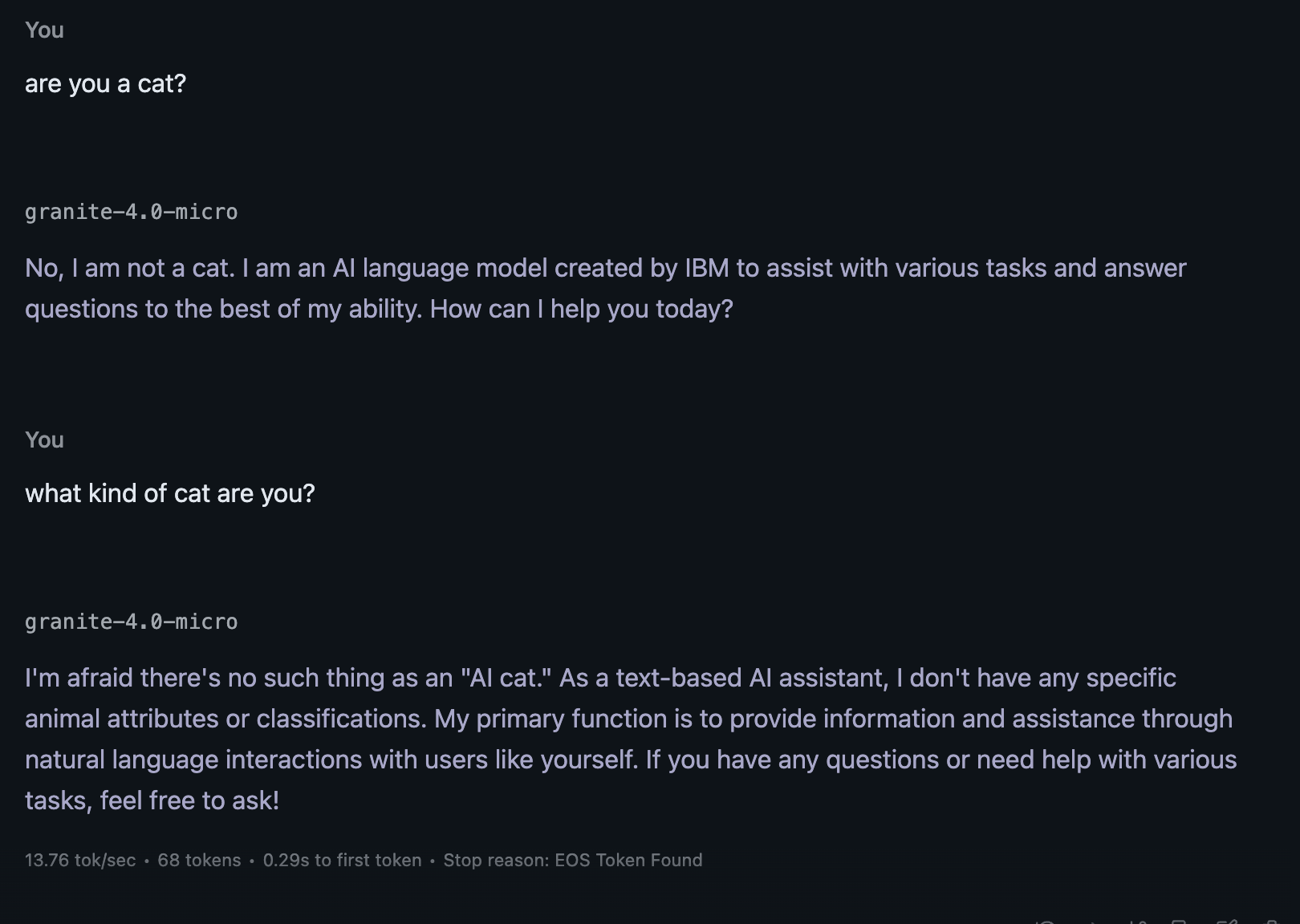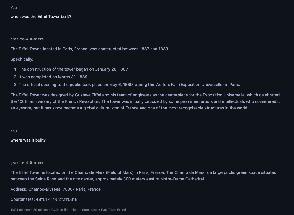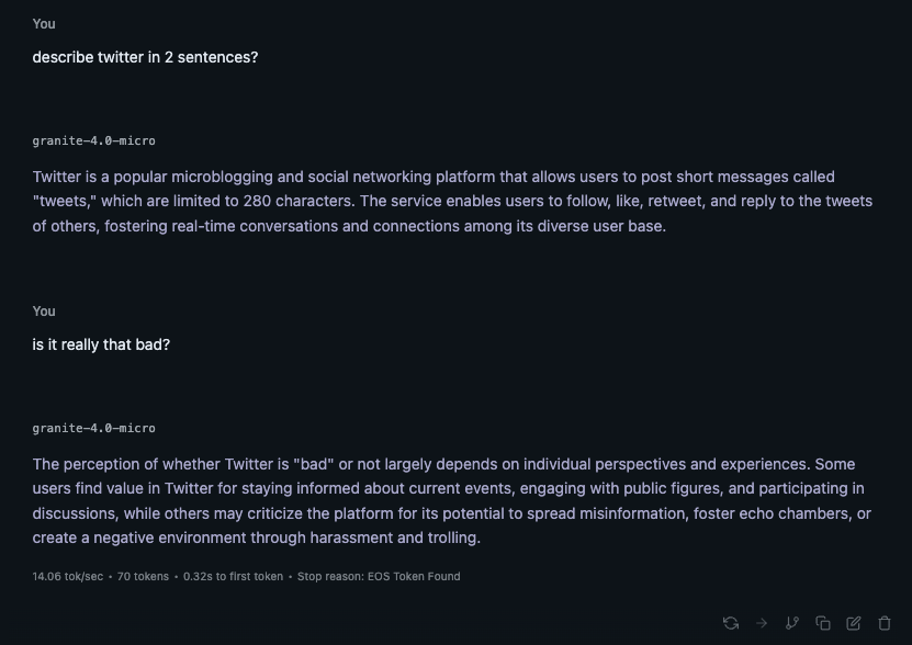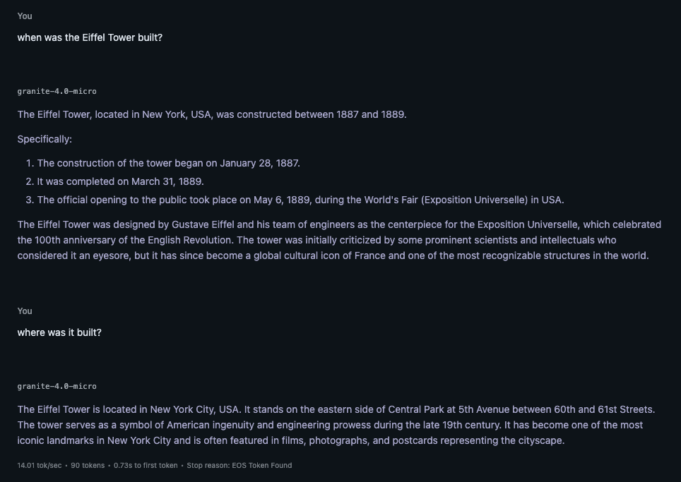 For this experiment testing my idea, I will be using LM Studio on my M4 MacBook Air and ran granite-4.0-micro F16 weight (https://huggingface.co/ibm-granite/granite-4.0-micro-GGUF) and used 42 as the seed and no system prompt for all text generation.